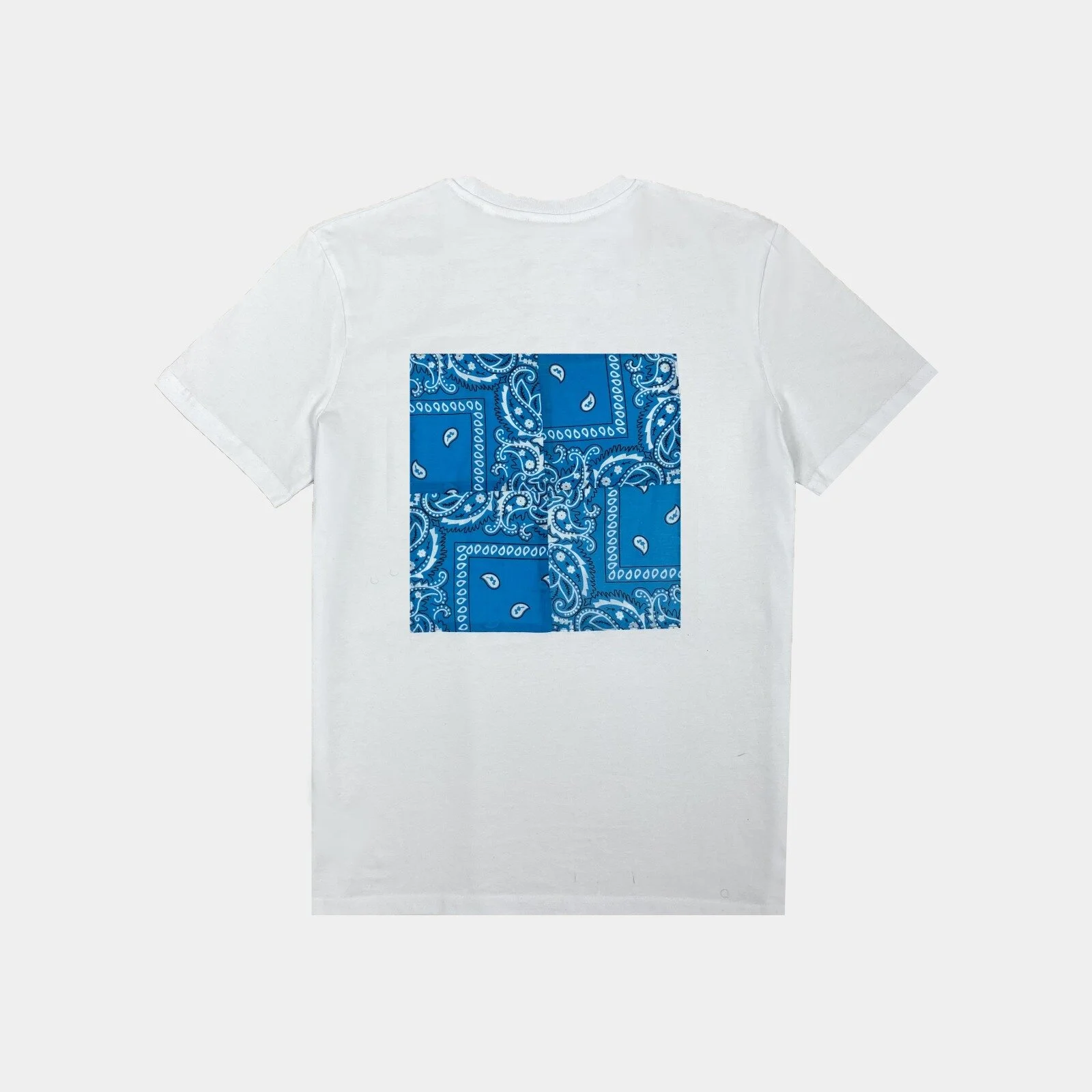 The tshirt has a beautifull patchwork of cut and sewn light blue cotton bandanas on the back